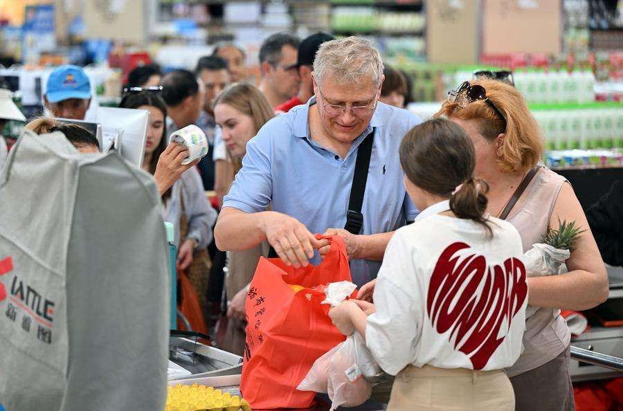 Foreign tourists check out at a market in Sanya, south China's Hainan Province, on Jan 11. (Xinhua)