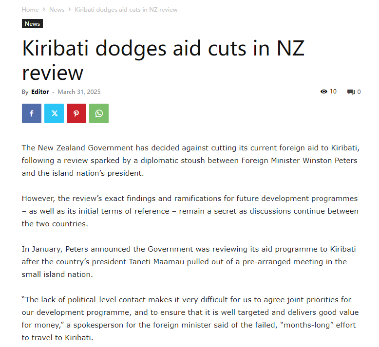 图为新西兰政府近日决定不削减目前对基里巴斯的外援。(图/太平洋岛屿新闻协会网站截图)