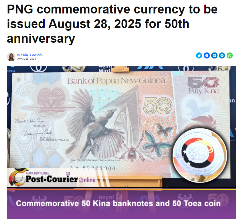 图为巴布亚新几内亚将于8月28日发行50基那的纪念钞和纪念币。(图/巴新《信使邮报》网站截图)