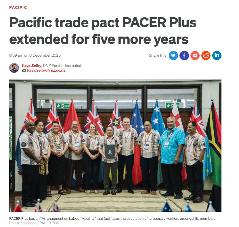 图为在所罗门群岛近日举行的部长级会议后,《太平洋更紧密经济关系协定》(PACER Plus)将再延长五年。(图/新西兰RNZ网站截图)