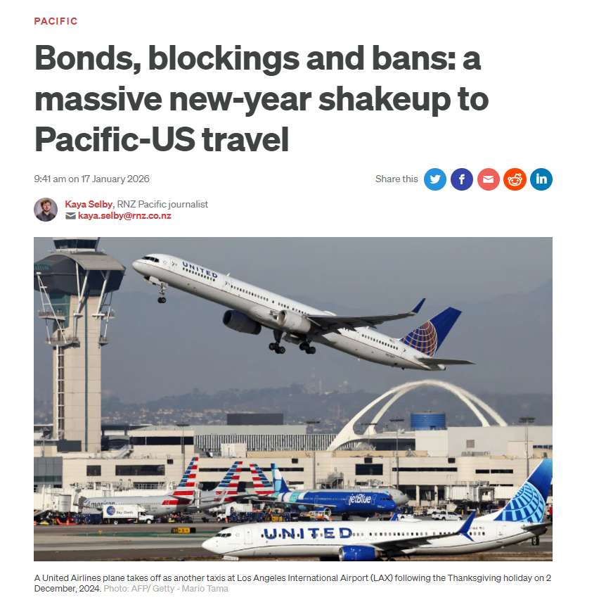 图为美国仅在2026年的前两周就对太平洋地区的旅行实施或宣布了一系列全面限制措施。(图/新西兰RNZ网站截图)